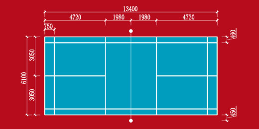羽毛球場地是一個長13.40米,雙打寬6.10米,單打寬5.18米,場地中央被球網(兩邊柱子高1.55米,中間網高1.524米)平均分開的長方形場地。